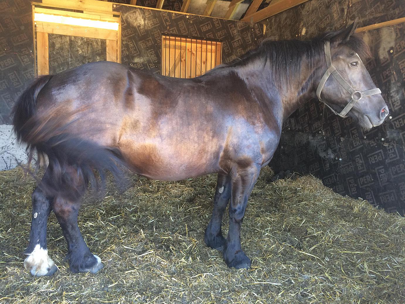 Klacz, typ pogrubiony, zaźrebiona śląskim ogierem .Wyźrebienie: październik.Chodzi w zaprzęgu w pojedynkę i w parze.