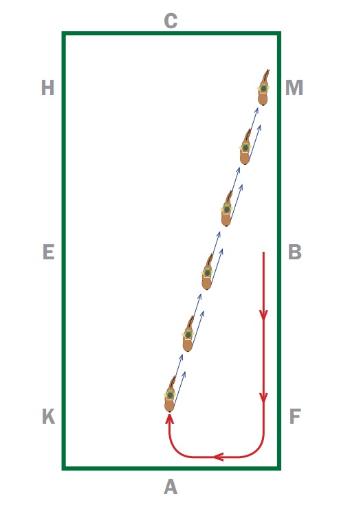 zachować ustawienie boczne konia, jak do zmiany kierunku, z tym, że koń pozostaje na ścianie.