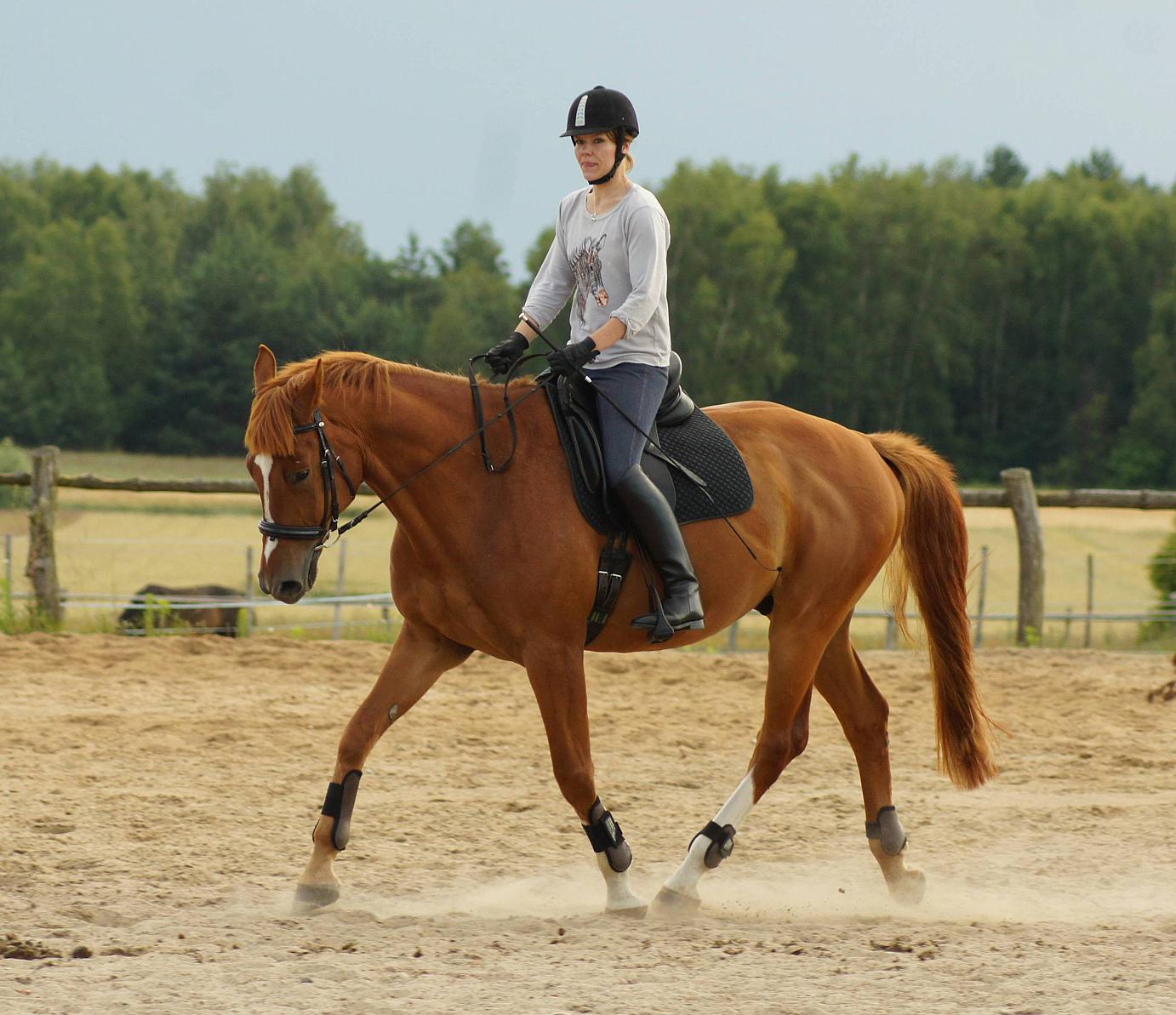 Wydzierżawię 8 letniego wałacha rasy wlkp. Duży - ok 172 cm w kłębie. Koń jest spokojny i bezpieczny do jazdy, nie bryka, nie płoszy się, nie ciągnie do przodu. Chodzi w teren sam oraz z innymi końmi, idealny jako koń spacerowy ale też do ambitniejszych jazd - ale wtedy potrzebuje stanowczego jeźdźca. Nie nadaje się do skoków. Koń stacjonuje w kameralnej stajni w Kicinie niedaleko Poznania, nie ma możliwości przeniesienia. Ilość jazd i koszty do ustalenia. Tylko odpowiedzialne pełnoletnie osoby.