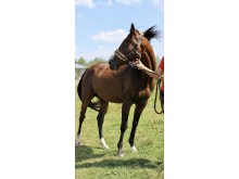 Przyjął jeźdźca i chodzi w 3 podstawowych chodach, ma duży potencjał do skoków. Bardzo wygodny, nie bryka, odczulany, wchodzi bez problemu do przyczepy.