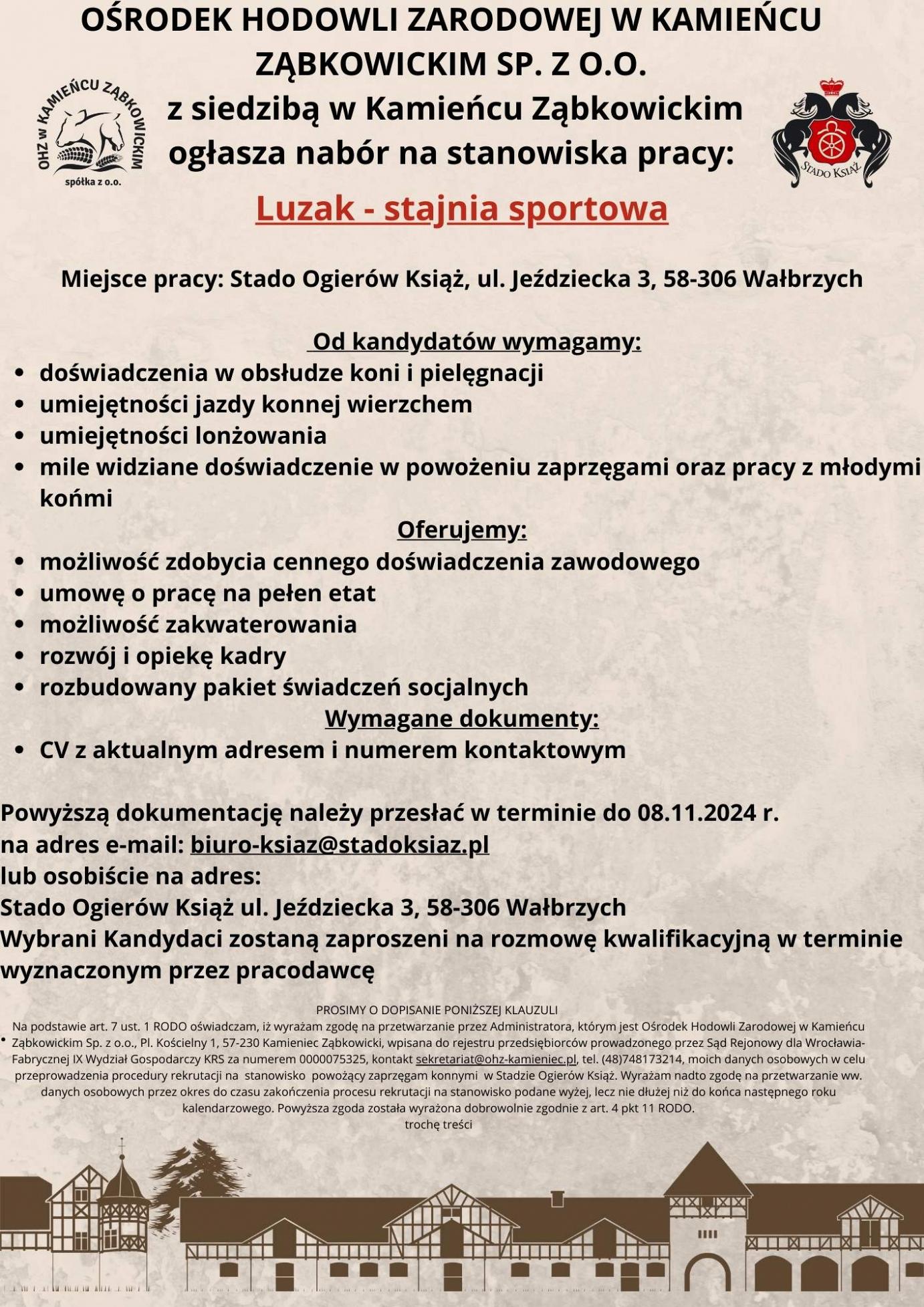 Miejsce pracy: Stado Ogierów Książ, ul. Jeździecka 3, 58-306 Wałbrzych...