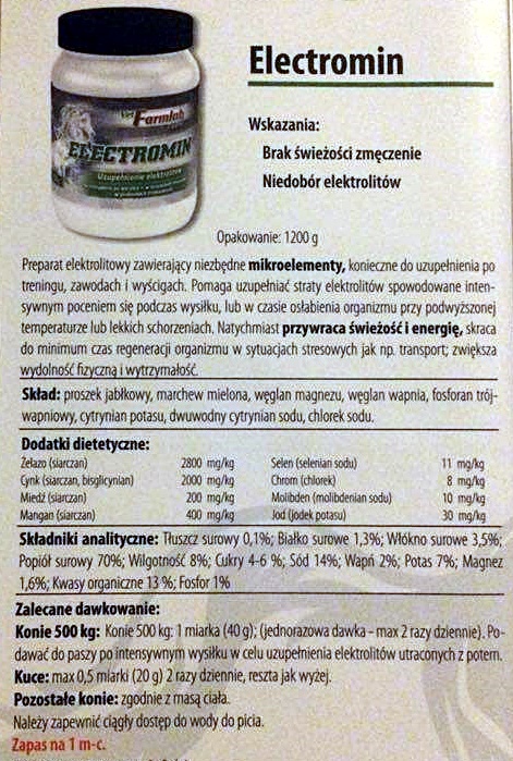 Witam, mam do zaoferowania elektrolity Electromin marki VetFarmlab w atrakcyjnej cenie. Produkt ten szybko uzupełnia poziom elektrolitów wypłukiwanych wraz z potem. Regeneruje oraz nawadnia organizm konia przywracając mu świeżość i energię. Preparat ten jest bardzo istotny w żywieniu konia - szczególnie w nadchodzącej porze letniej. Dostępny jest w smaku marchwiowo-jabłkowym. Zainteresowanych proszę o kontakt drogą mailową. Do ceny należy doliczyć koszt wysyłki. :)